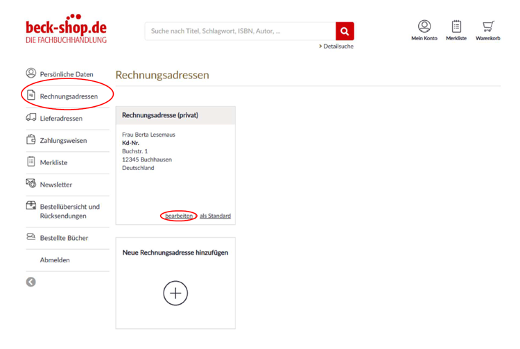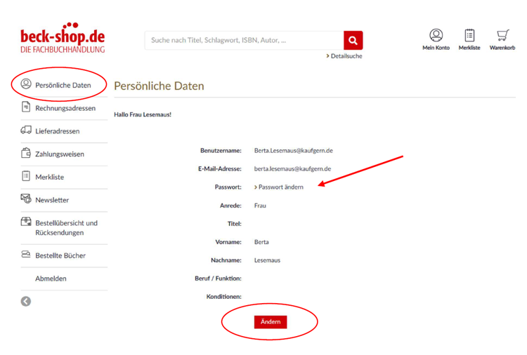 Bitte melden Sie sich dazu auf beck-shop.de an, um zu Ihrem Kundenkonto zu gelangen. Sie gelangen nach der Anmeldung direkt in den Bereich "Meine Daten".
