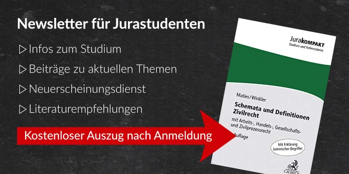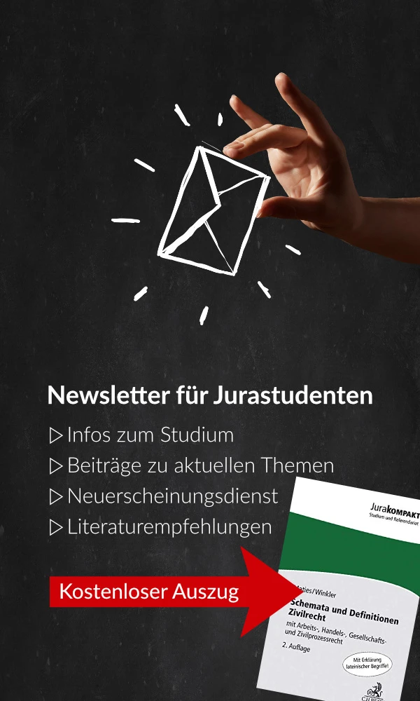 Registriere dich jetzt für unseren studentischen Newsletter und erhalte einen kostenlosen 55-seitigen Auszug aus dem Werk „Schemata und Definitionen Zivilrecht“ von Maties/Winkler zum Download. Inklusive relevanter und unbedingt zu beherrschender Definitionen. Der Auszug unterstützt dich somit ideal bei deiner nächsten Prüfungsvorbereitung!