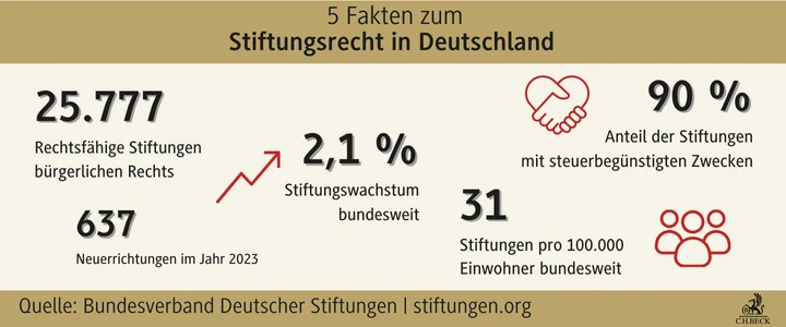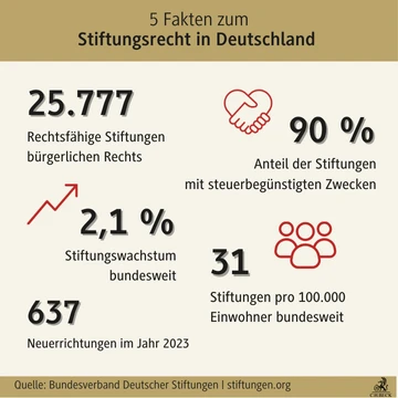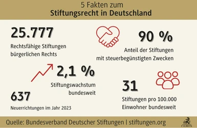 Deutschland ist in Europa eines der stiftungsreichsten Länder. Stand 31. Dezember 2023 gab es 25.777 rechtsfähige Stiftungen bürgerlichen Rechts. 637 Stiftungen wurden allein 2023 neu errichtet. Die Zahl der Stiftungen wächst – im Vergleich zum Vorjahresbestand um 2,1 Prozent (Quelle: Bundesverband Deutscher Stiftungen, Stand: 2024).